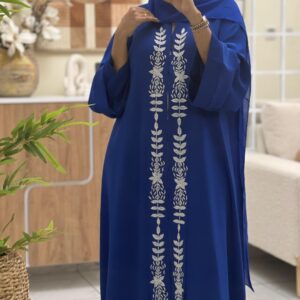 The Royal Sapphire Elegance Abaya is an embodiment of sophistication, designed for the modern woman who values both luxury and modesty. The deep sapphire blue fabric, adorned with delicate silver embroidery, creates a captivating contrast that enhances its regal appeal.